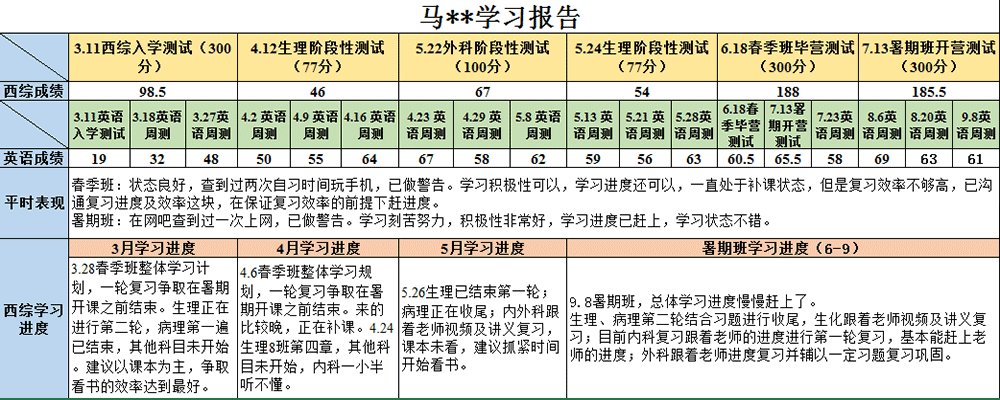 | 9:00-12:00 | 英语周测 | 内科(隋准) | 英语周测讲解 | 外科 | 自习 | 自习 | |